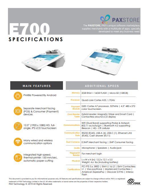• PAX E700 All-in-one POS Terminal