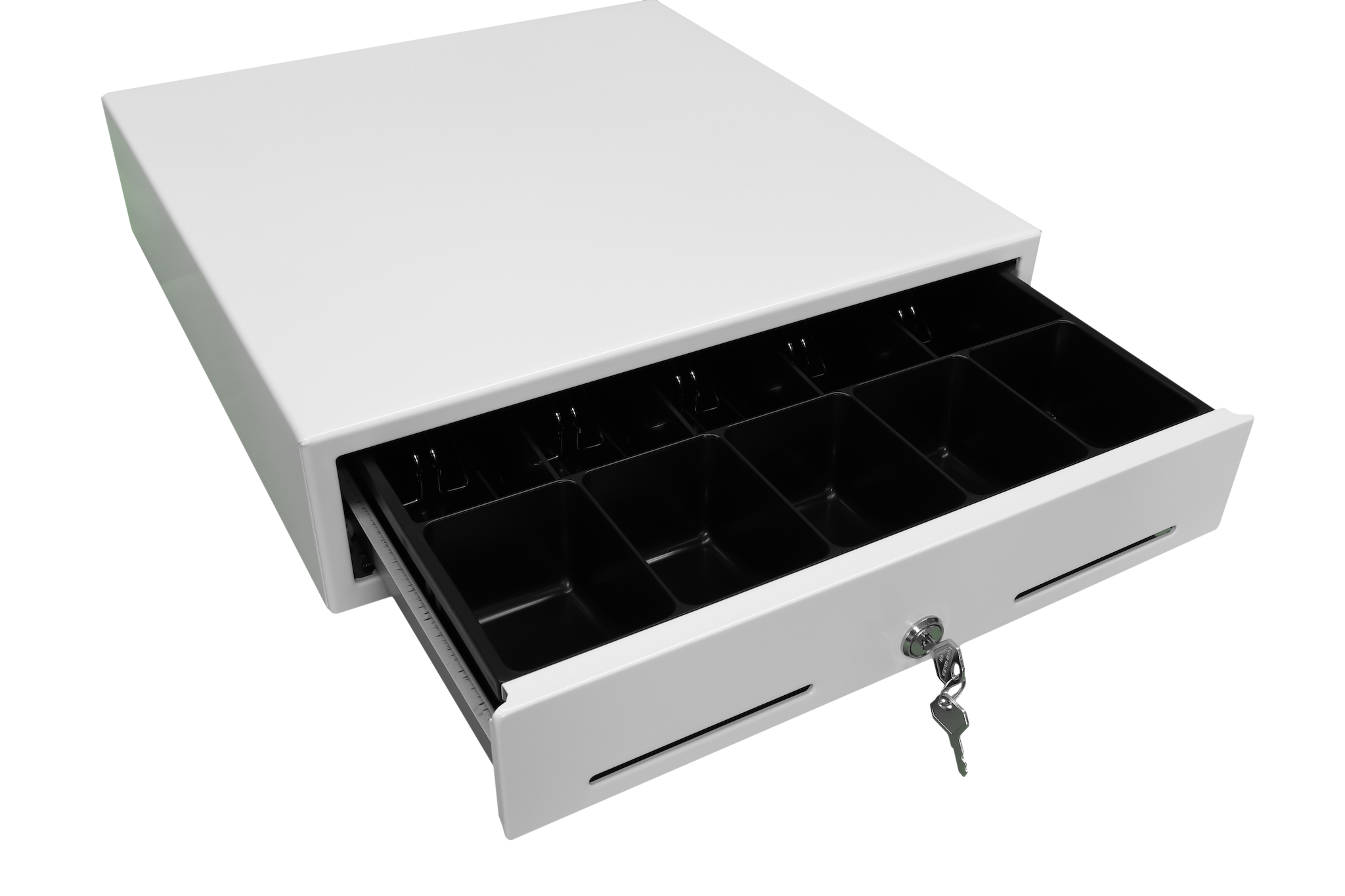 Measuring 16”W x 16.5”D x 4.5”H, our M-S cash drawer fits neatly under the PAX E700 or can be mounted under your counter. A bright-white powder-coated finish complements the PAX E700. The cash drawer contains 5 bill trays, 5 coin trays, 2 media slots in the drawer front and a key lock. The drawer weighs 20 pounds and is all steel construction. A 6’ long cable is also included for LOU to trigger the cash drawer to open at the appropriate time. The M-S cash drawer comes with a manufacturer’s 2-year warranty.