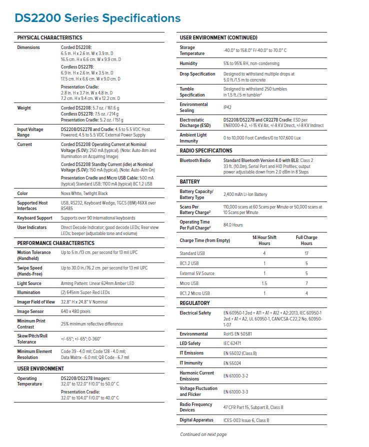 To quickly process your transactions, the Zebra DS2208 will scan D1, D2, and QR codes. It comes with a 6’ long cord and a 10” high goose-neck style cradle, so you can scan cradled or handheld. The scanner measures 6.5” H x 2.6” W x 3.9” D and weighs 5.7 oz.